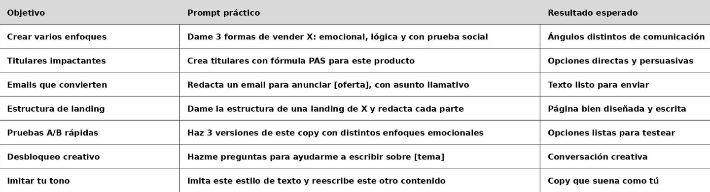 La fórmula PAS (Problema – Agitación – Solución) es un clásico del copywriting. Y ChatGPT la domina si se lo explicas bien.