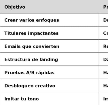 🔑 Consejo: Si el titular suena muy genérico, dile que se dirija a un perfil específico. Ejemplo: “Escribe para emprendedores de 25 a 35 años que odian perder tiempo”.
